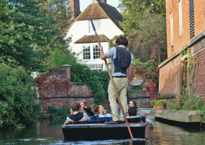 „Echt“ englisch durch die Stadt: In einem traditionellen Punting-Boot fahren Sie auf dem Fluss mitten durch die Stadt, vorbei an historischen Gebäuden und voll kleiner Anekdoten. Ein Boot fasst jeweils sechs Personen, von denen einer im Stehen mit einer Art Stechpaddel für die Fortbewegung des Bootes sorgen muss. Ein Guide führt Ihre Schülergruppe an, erklärt die Technik und Geschichten über die Umgebung, durch die Sie fahren. Großer Spaß ist garantiert!